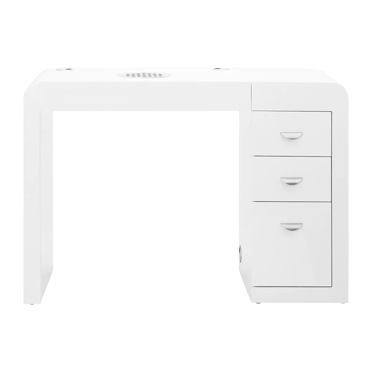 Trije prostorni predali olajšajo organizacijo in shranjevanje najpotrebnejše kozmetike in orodij. Miza je opremljena s praktičnim absorberjem , ki učinkovito zmanjšuje količino škodljivega prahu ter zagotavlja čist in svež zrak na delovnem mestu . Hkrati pa zaradi integracije v mizno površino ne zavzema dragocenega delovnega prostora. Posebej zasnovani prostori za kable olajšajo organizacijo potrebnih naprav v salonu , kot so strojčki za vrtanje nohtov, svetilke za nego ali svetilke za nohte, kar omogoča skrivanje kablov.