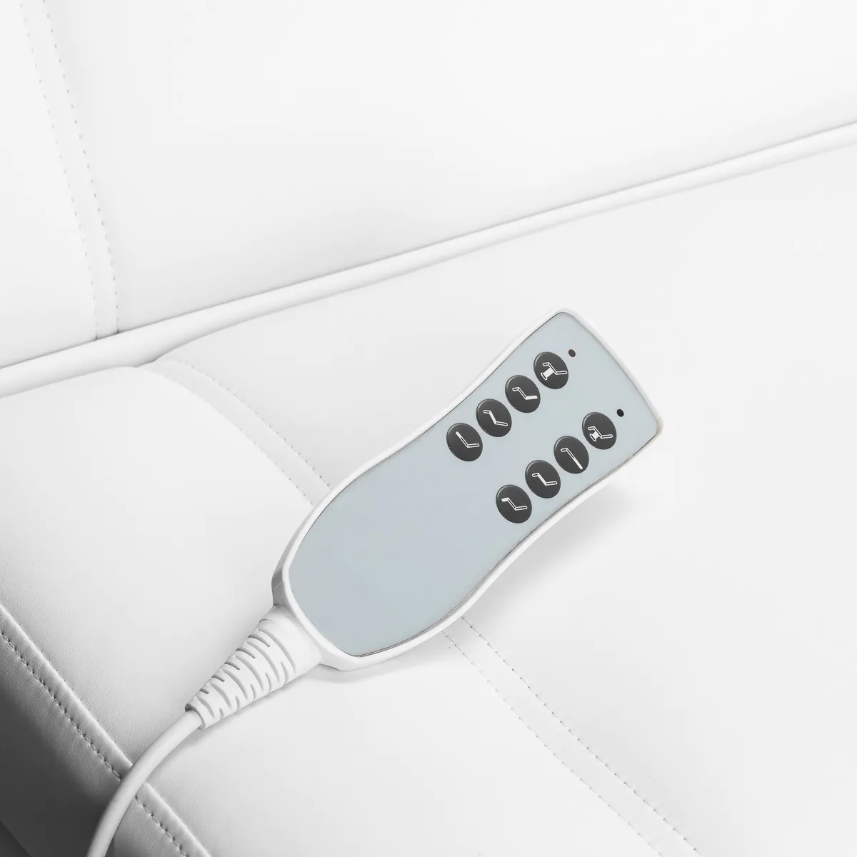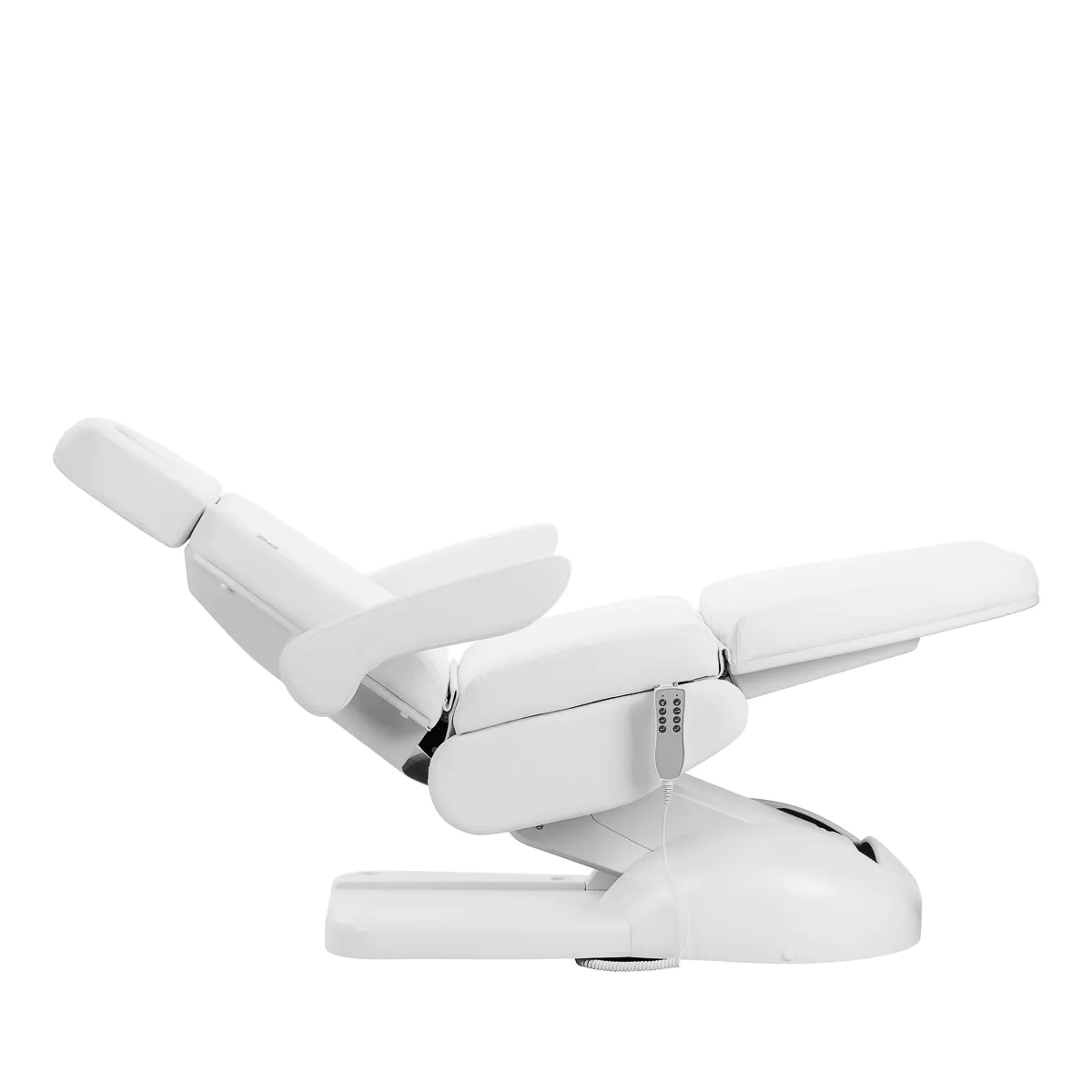 Priročno upravljanje z žičnim daljinskim upravljalnikom omogoča natančno nastavitev stola v štirih ravninah: nastavitev višine, naklon naslonjala, položaj opore za noge in funkcija zibelke. Širok razpon nastavitev omogoča popolno prilagoditev položaja glede na vrsto tretmaja – tako za udobje stranke kot ergonomijo strokovnjaka. Za lažjo uporabo lahko daljinski upravljalnik obesite na držala, ki se nahajajo na obeh straneh sedeža.